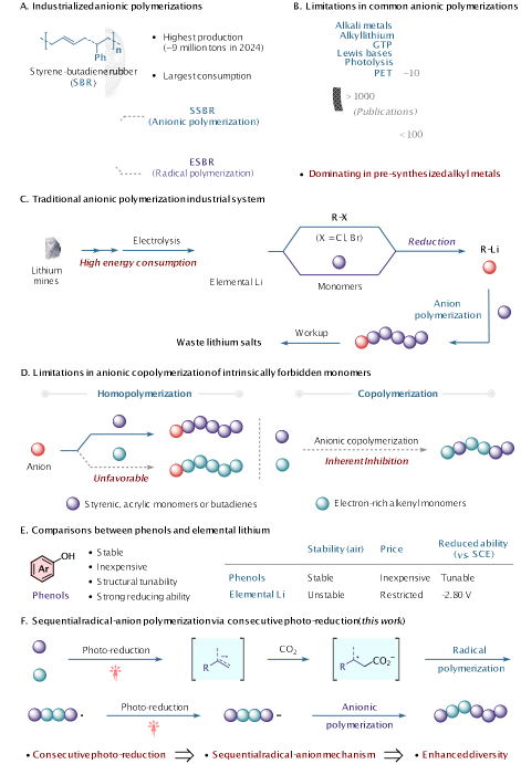 自由基聚合与阴离子聚合是合成橡胶、通用塑料及功能高分子材料的核心方法,但其应用仍均存在一些局限。自由基聚合对α-烯烃反应活性低,并且对苯乙烯和丁二烯的聚合速率远低于丙烯酸类单体;而传统阴离子聚合高度依赖高活性金属试剂(如有机锂化合物),存在合成能耗高、安全风险大及金属资源难以回收等问题。此外,不同电子性质单体的共聚也因反应活性差异而存在固有困难,限制了聚合物结构与性能的多样化。因此,开发一种不依赖金属试剂、可兼容多种单体的聚合新方法,对推动高分子合成果冻传媒