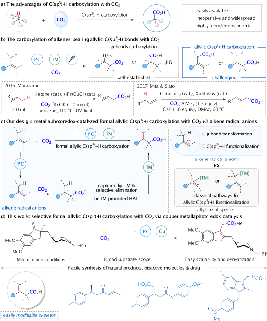 品,其烯丙位C(sp3)–H选择性转化是实现烯烃高值化的重要途径。利用CO2参与烯丙位C(sp3)–H羧基化反应,可快速构建重要的丁烯酸类化合物,因而备受关注。然而,现有方法往往依赖紫外光或当量金属试剂等苛刻条件,导致底物类型局限、应用受限。因此,开发高效催化体系在温和条件下实现CO2参与烯丙位C(sp3)–H高选择性羧基化,是亟待解决的重要难题。